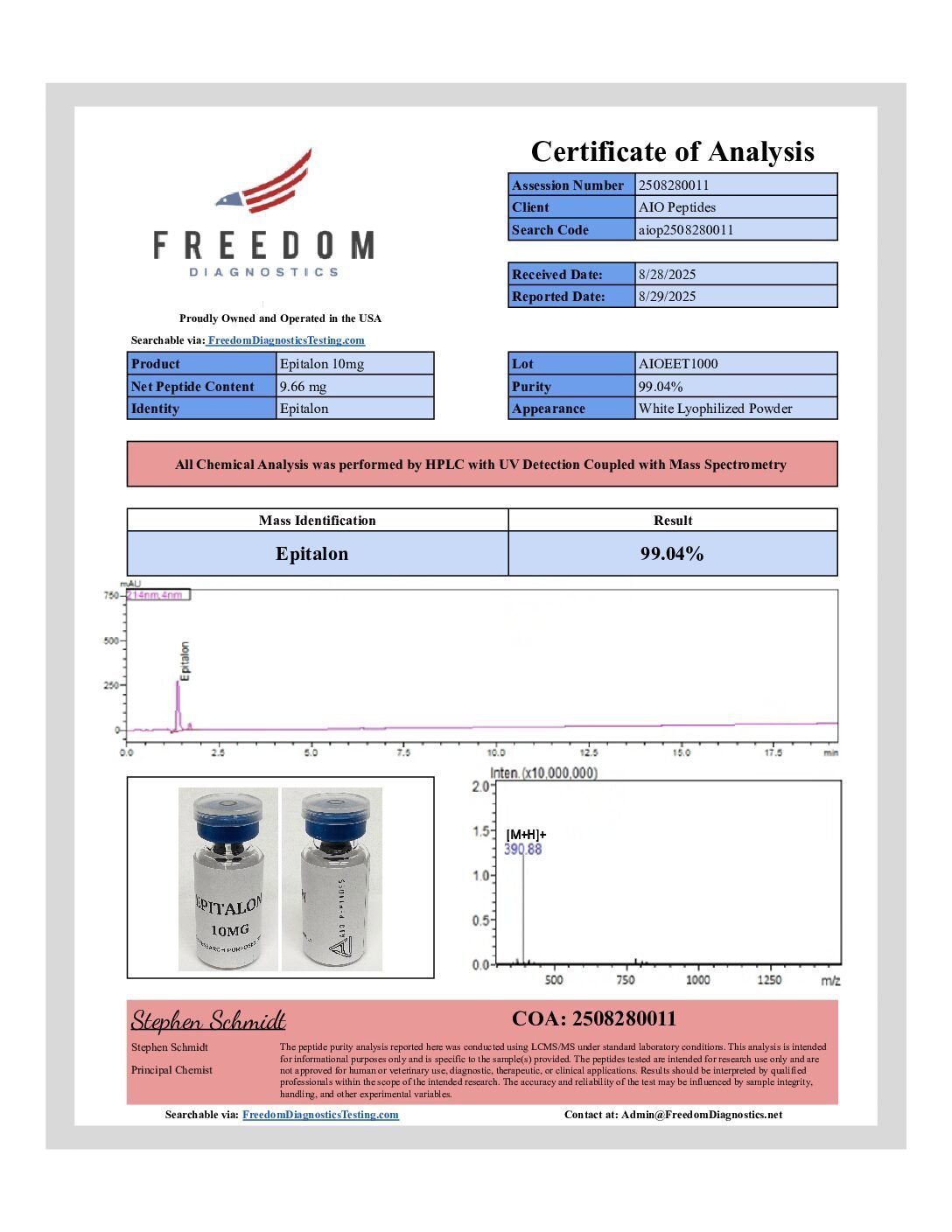 Epitalon is a synthetic tetrapeptide (Ala-Glu-Asp-Gly) derived from the naturally occurring peptide epithalamin, which is secreted by the pineal gland. Recognized for its potential anti-aging and regenerative properties, Epitalon is believed to regulate the production of melatonin, support telomerase activity, and promote cellular longevity. By enhancing telomere maintenance and modulating circadian rhythms, it may contribute to improved sleep, metabolic balance, and overall vitality. Research has explored its role in healthy aging, oxidative stress reduction, and lifespan extension, with promising implications for age-related diseases and physiological decline.