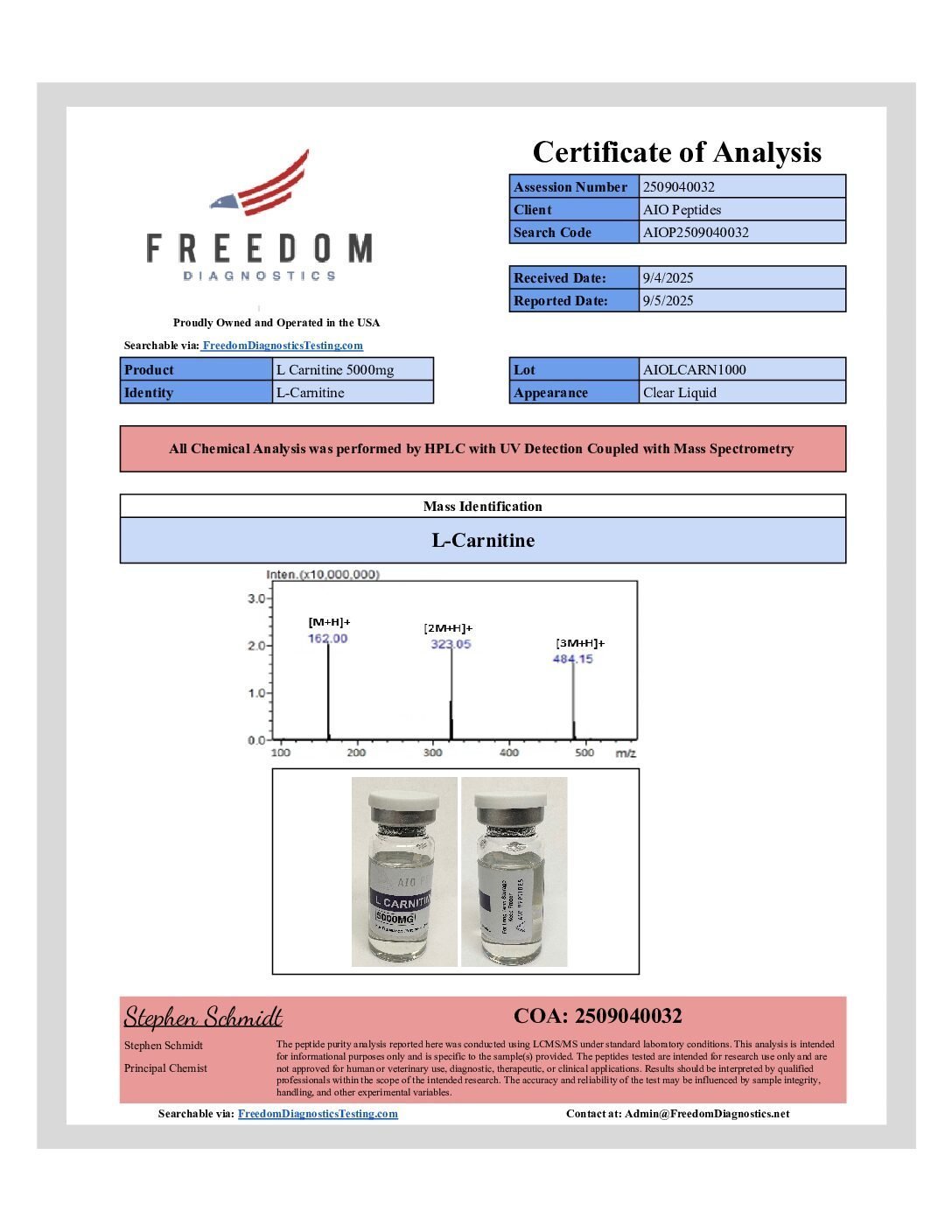 L-Carnitine 5000MG at 500MG/ML is a naturally occurring quaternary ammonium compound synthesized from the amino acids lysine and methionine. It plays a critical role in energy metabolism by facilitating the transport of long-chain fatty acids into mitochondria for β-oxidation, thereby supporting ATP production. Beyond its essential function in cellular energy, L-Carnitine has been widely studied for its roles in exercise performance, cardiovascular health, fertility, neuroprotection, and metabolic disorders. *DO NOT REFRIGERATE*